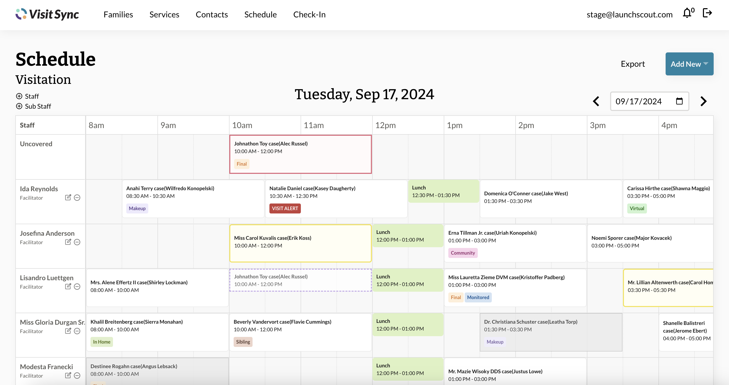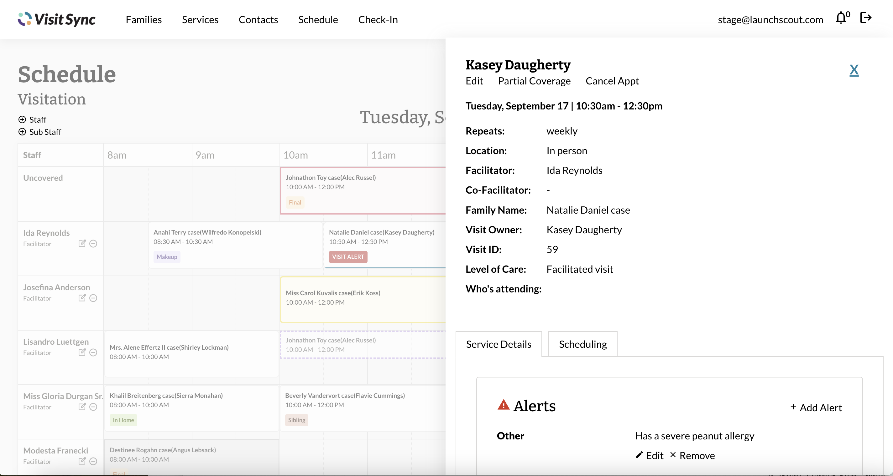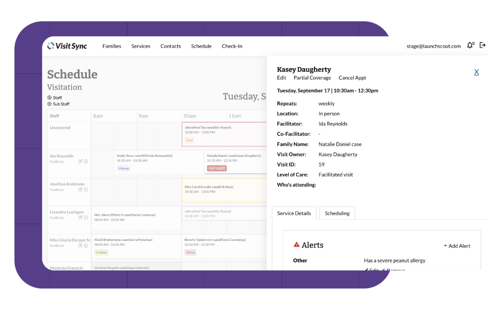 See which facilitators are working each day, their scheduled visits, uncovered visits, and important visit details, all in one view. The schedule makes it easy to see what is happening on a given day, keeps everyone informed of what’s changing, and highlights what needs attention.